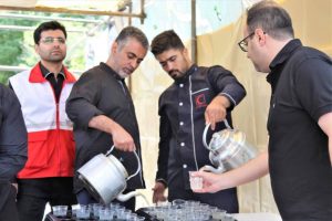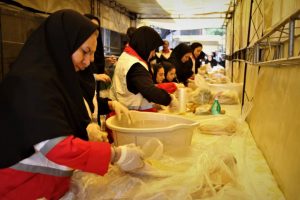 این اجتماع بزرگ که در آن فضا و جانها با پرچم حرم با صفای قمر بنی هاشم، حضرت ابوالفضل العباس (ع) متبرک و معطر شده بود، جوانان اقدام به پخت و توزیع غذای نذری و شربت در میان مردم کردند.